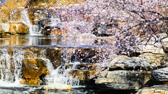 Die Bergpfirsichblüten erwecken Ende März die Frühlingslandschaft.