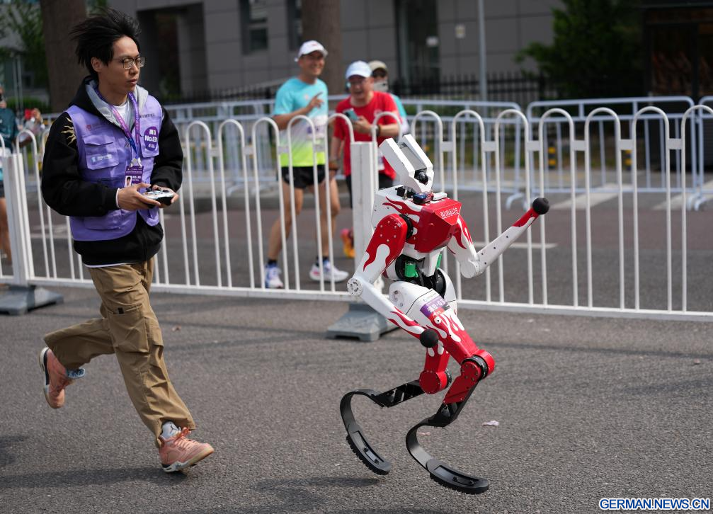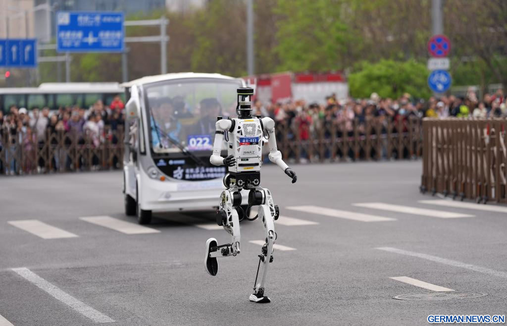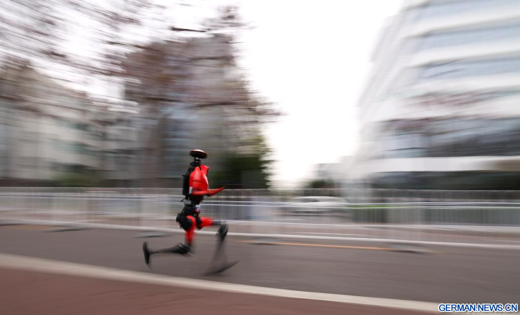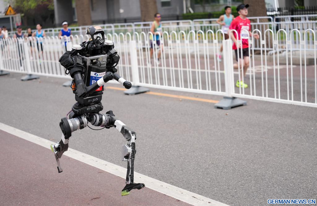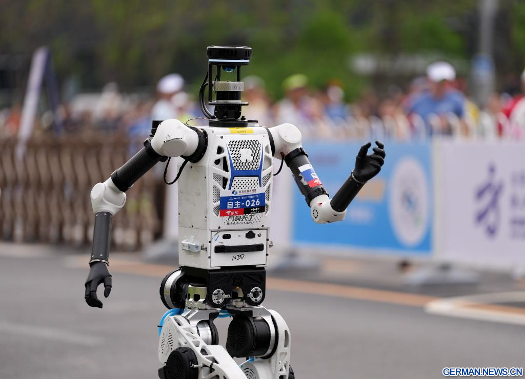 Humanoider Roboter „Flash“ des Teams Qitiandasheng aus der autonomen Kategorie läuft beim Beijing E-Town-Halbmarathon und beim Halbmarathon für humanoide Roboter im Wirtschaftlich-Technologischen Entwicklungsgebiet von Beijing. (Quelle: Xinhua/Luo Yuan)