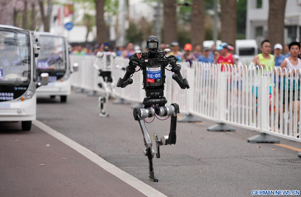 Humanoider Roboter „X1“ (rechts, vorne) des Teams Pofengzhe aus der Kategorie der ferngesteuerten Roboter läuft beim Beijing E-Town-Halbmarathon und beim Halbmarathon für humanoide Roboter im Wirtschaftlich-Technologischen Entwicklungsgebiet von Beijing im Südosten Beijings, China, 19. April 2026. (Quelle: Xinhua/Luo Yuan)