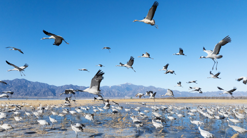 Eine große Anzahl von grauen Kranichen und Wildenten ist kürzlich im international wichtigen Feuchtgebiet Yeya-See im Beijinger Bezirk Yanqing eingetroffen