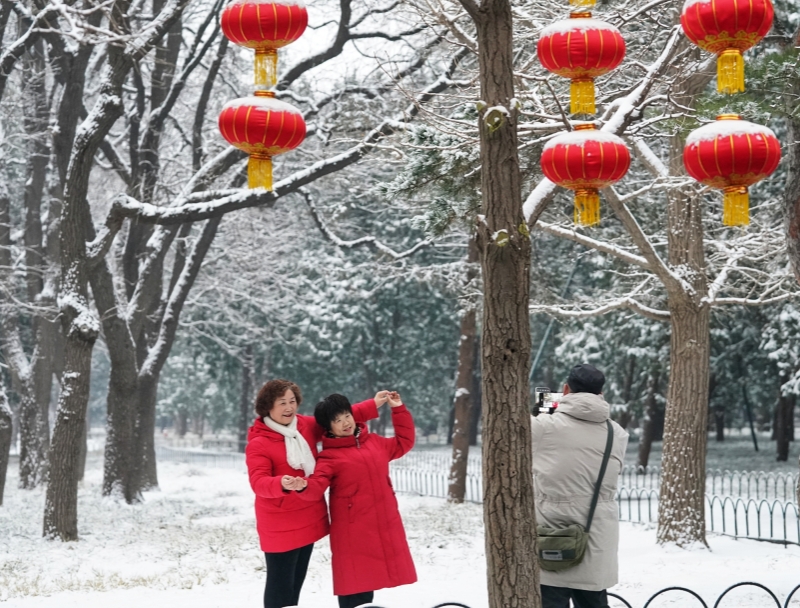 Ein Frühlingsschnee hat die Hauptstadt Beijing bedeckt. Nach dem Schneefall erscheint der Himmelstempel-Park wie ein prächtiges Gemälde, das die historische Tiefe und kulturelle Ausstrahlung der Stadt widerspiegelt.