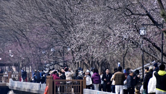Menschen bewundern die Pfirsichblüten im Bezirk Chaoyang in der chinesischen Hauptstadt Beijin