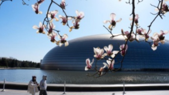 Besucher betrachten Magnolienblüten in der Nähe des Nationalen Zentrums für Darstellende Künste in Chinas Hauptstadt Beijing, 9. März 2026.