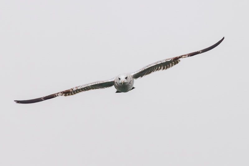 Eine sibirische Silbermöwe breitet ihre Flügel aus und fliegt