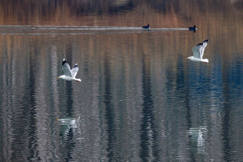 Sibirische Silbermöwen fliegen tief über der Wasseroberfläche