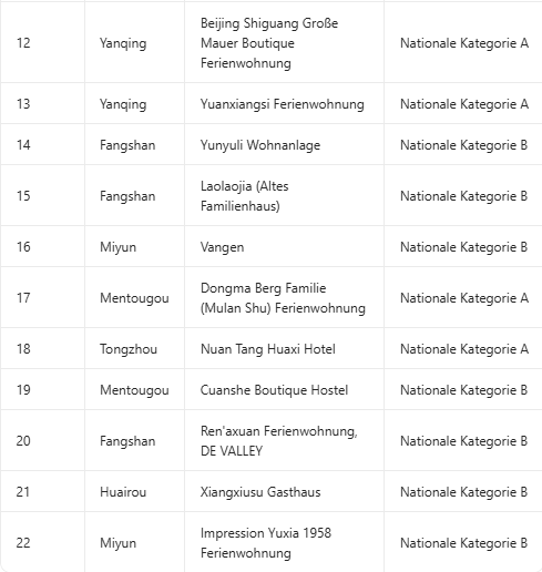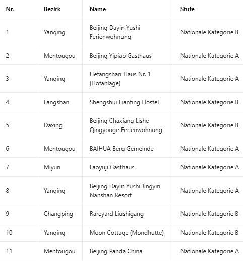 Liste der national eingestuften Touristen-Unterkünfte der Kategorien A und B in Beijing